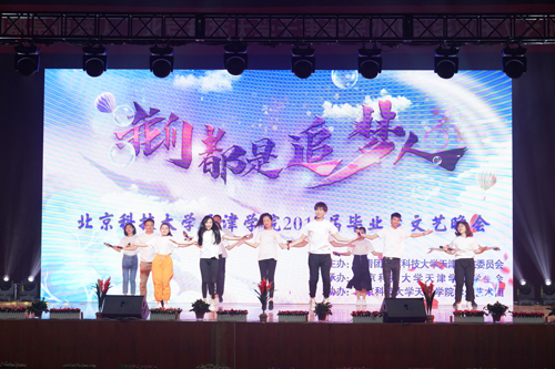 由共青團北京科技大學天津學院委員會,北京科技大學天津學院學生會承辦,北京科技大學天津學院藝術團協辦的“我們都是追夢人”北京科技大學天津學院2019屆畢業生文藝晚會于5月22日晚19:00在體育館隆重舉行。北京科技大學天津學院院長王斌,黨委書記丁煦生,黨委副書記葉振楠、牛犁,財務總監王俊敏,學術委員會主席宋存義,教務處處長張建華,信息工程學院院長許學東,圖書館館長劉淑娥,外語系主任梁素芹,傳統文化研究院副院長胡寶嘉,招生就業處處長柯瑜,基建產業處處長孟祥瑜,人事處常務副處長王軍,學生處常務副處長田勇,科研處副處長、實驗室管理中心副主任羅富臣,國際交流處副處長張悅,后勤處副處長劉杰,團委書記殷實等嘉賓以及來自各院系畢業學子相聚一堂,暢敘畢業情誼。