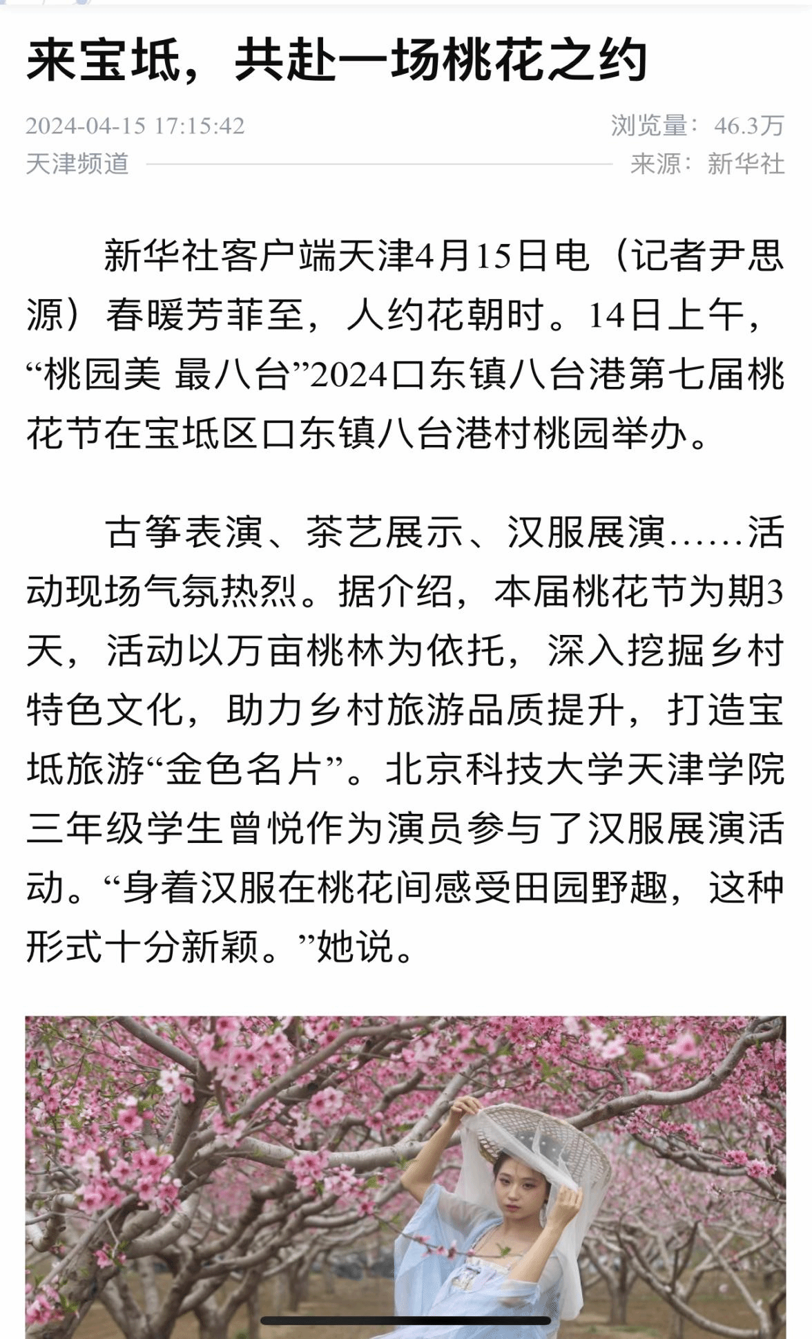 共赴桃花之約,盡享春日盛景。本次活動,北京科技大學天津學院團委開啟了一場青年學生與鄉村振興的“雙向奔赴”,不僅得到了主辦方的高度評價和認可,也受到了人民網、新華社、網易新聞、寶坻融媒等多家媒體的宣傳報道。