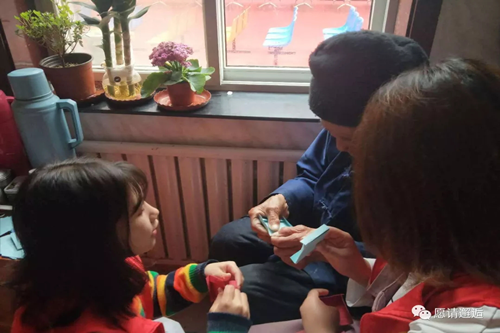 志愿者們懷揣著一顆顆期待與敬重的心,在經過四十分鐘的車程后,大家到達了敬老院。在敬老院負責人的帶領下,大家三五成群進入老人房間,和老人們聊關于他們的日常生活和曾經發生過的故事,同時志愿者們還教老人如何制作折紙果盤。在敬老院有一位老奶奶今年八十多歲,雖然眼睛看不太清,但在看到志愿者的褲子被磨破了一個洞后,仍堅持著拿針線要為他把破洞縫上,大家無一不被老人的真誠所感動。許多老人聽說大家等會要表演,都早早地從房間出來坐在舞臺下等著志愿者們演出,大家在表演節目的同時也將我們提前準備好的水果等愛心物品一一送給老人,看著老人們一個個面帶著笑容為大家鼓掌的樣子,每個人都覺得這段經歷是值得的。