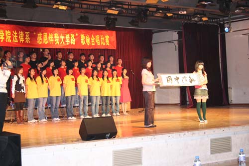 晚上7點,比賽正式開始,此次比賽以精神面貌、音樂表現(xiàn)、配合效果和形式創(chuàng)新為評分標(biāo)準(zhǔn),參賽隊伍以現(xiàn)場書法、心型燭光、伴舞合唱、懸拉橫幅、朗誦等形式和造型演繹“感恩伴我大學(xué)路”的主題,《讓世界充滿愛》、《紅旗飄飄》、《明天會更好》等曲目傳達出了法律人感恩的心聲。感人動聽的歌聲,整齊統(tǒng)一的隊伍,熱情奔放的演唱使得比賽現(xiàn)場氣氛極其熱烈,不時傳出陣陣鼓掌。跳躍的音符抒發(fā)出參賽隊伍內(nèi)心的喜悅,激昂的歌聲體現(xiàn)出法律人的颯爽英姿。經(jīng)過精彩的表演、激烈的角逐,法學(xué)064班獲得了比賽的第一名,051班、071班并列第二名,065班、073班為第三名,051班和071班獲得精神文明獎,065班和075班獲得最佳創(chuàng)意獎。