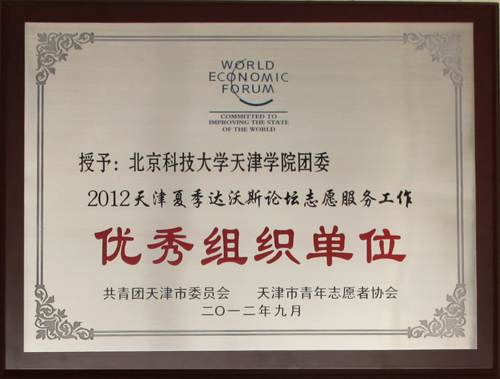 2012年夏季達沃斯論壇在天津梅江會展中心舉行。金沙城js93線路檢測中心7名青年志愿者按照論壇籌委會、團市委、市青年志愿者協會的要求,秉承“奉獻、友愛、互助、進步”的志愿精神,用自己的優質服務,向中外來賓展現了北京科技大學天津學院青年志愿者的良好服務形象和精神風貌,同時也得到了天津市相關部門的贊揚與肯定。最終,金沙城js93線路檢測中心團委被評為“2012天津夏季達沃斯論壇志愿服務工作優秀組織單位”。