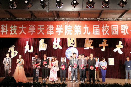 4月16日晚7:00,北京科技大學天津學院第九屆校園歌手大賽在學生活動中心二樓舉行。副院長曾廣晟,教務處處長尹常治,信息系主任許學東,材料系主任沈衛平,外語系主任梁素芹,藝術系主任胡建華,圖書館館長劉淑娥,學生處處長葉振楠,基建后勤處副處長張衛,學生處副處長代鴻濱,團委書記羅富臣,土木系黨總支書記孟祥瑜,外語系黨總支書記何紅升,信息系黨總支副書記馮海燕,管理系黨總支副書記王軍出席了本次校園歌手大賽。張鵬、劉義寶、高麗、陳倩、韓程羽五位老師擔任本次大賽評委。