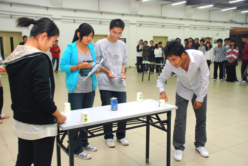 由材料科學(xué)與工程系、機械工程系學(xué)生組成的16只代表隊參與了本次運動會。運動會共設(shè)有6個團體項目:乒乓球滾卷尺,氣球吹紙杯,沙弧球,夾乒乓球,轉(zhuǎn)球打易拉罐,壘蘋果。以每只代表隊完成任務(wù)所需時間進行排序,用時最少者為冠軍隊。比賽開始后,