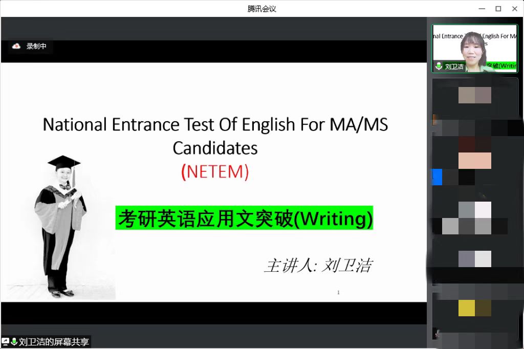 為了使金沙城js93線路檢測中心學生掌握碩士研究生入學英語考試的方法,總結和梳理英語應用文寫作規律,2022年7月15日上午9點,由學院教務處、教師發展中心主辦,外國語學院、智能制造學院承辦的第二講考研備考專題講座圓滿開展。本期講座采取線上直播形式,由外國語學院劉衛潔老師主講,全院共300余名學生參加了本次講座。