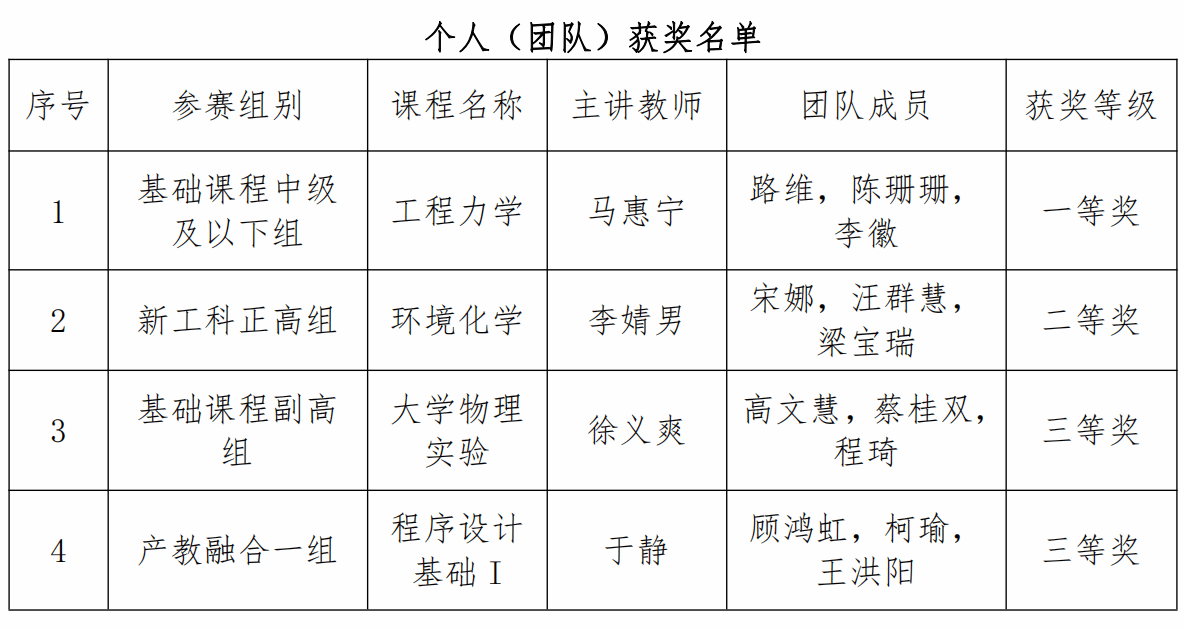 本次比賽,天津市共評選出一等獎 24名、二等獎 56 名、三等獎 72 名,金沙城js93線路檢測中心在獲獎等級和獲獎數量上均取得新突破,共獲一等獎1名、二等獎1名、三等獎2名,在同類高校中名列前茅。其中:基礎部教師馬惠寧領銜的《工程力學》課程團隊榮獲“基礎課程中級及以下組”一等獎;材料與環境學院教師李婧男領銜的《環境化學》課程團隊榮獲“新工科正高組”二等獎;實驗室管理中心教師徐義爽領銜的《大學物理實驗》課程團隊榮獲“基礎課程副高組”三等獎;信息工程學院教師于靜領銜的《程序設計基礎I》榮獲“產教融合一組”三等獎。