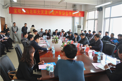 4月26日上午9點,天津市寶坻區和天津學院共同主辦了“寶坻區與北科大天津學院產學研合作研討會”。寶坻區科學技術委員會主任閆秀余、副主任申國慶、京津新城管委會副主任王永,天津學院院長郭景文、黨委書記王斌、副院長曾廣晟、教務處處長尹常治,北京科技大學材料科學與工程學院黨委書記吳春京、機械工程學院教授李威、賈志新,以及寶坻區相關企業負責人代表50余人參加了會議。