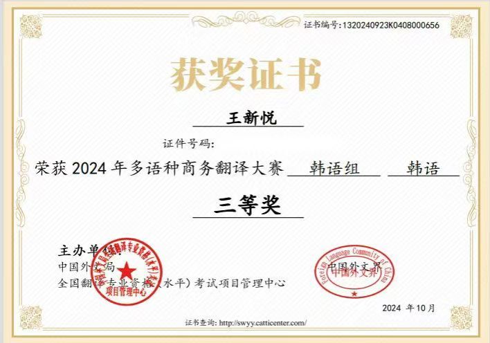 2024年9月28日至9月29日,由中國外文局和全國翻譯專業資格水平考試項目管理中心聯合主辦了2024年全國多語種商務翻譯大賽,我校朝鮮語專業2201班的王新悅同學在此次大賽...