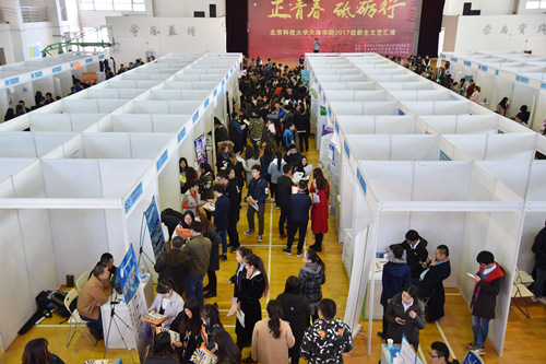 為深入貫徹黨的十九大會(huì)議精神,落實(shí)十九大報(bào)告中“堅(jiān)持就業(yè)優(yōu)先戰(zhàn)略和積極就業(yè)政策”,更好地搭建用人單位與畢業(yè)生雙向選擇的平臺(tái),為畢業(yè)生提供高質(zhì)量就業(yè)服務(wù),11月10日,北京科技大學(xué)天津?qū)W院2018屆畢業(yè)生首場(chǎng)大型校園雙選會(huì)在體育館成功舉行。此次雙選會(huì)共吸引130多家來(lái)自天津、北京、河北以及上海、廣東等地的企業(yè)到場(chǎng),招聘崗位2300余個(gè),涵蓋金沙城js93線路檢測(cè)中心各個(gè)專業(yè),吸引了2018屆畢業(yè)生以及其他年級(jí)學(xué)生2500多人到場(chǎng)。學(xué)院黨委副書記葉振楠、教務(wù)處處長(zhǎng)張建華、招生就業(yè)處處長(zhǎng)張衛(wèi)、各系黨總支書記參加了此次招聘會(huì)。