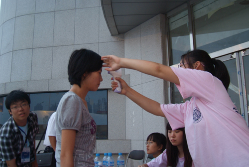 接站處備有體溫計(jì),在新生報(bào)到時(shí),學(xué)院迎新工作人員對(duì)新生進(jìn)行體溫測(cè)量,并做好詳細(xì)記錄,隨時(shí)關(guān)注新生的體溫狀況,并對(duì)甲型H1N1流感的預(yù)防、感染癥狀做了重點(diǎn)說(shuō)明和指導(dǎo)。