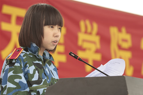 2009級新生代表外語系2009英語專業的雷亦男代表全體新生發言并帶領新生宣讀《入學誓詞》。她說:“在短暫的大學生涯中,我們只有珍惜寶貴的光陰,積極進取,勤奮創新,才能無愧于青春,無愧于科大,無愧于祖國;我們只有提高自身的綜合素質,刻苦求知,勇于實踐,才能真正地成為建設強大社會主義祖國的接班人。請師長們放心,我們一定會用百倍的信心,千倍的激情,萬倍的刻苦去完善自我,建設學校,貢獻社會,回報祖國。”。短短的幾句話表達了他們進入天津學院的激動心情和對未來的大學生活的無限憧憬。在雷亦男的領誓下,全體新生舉起右拳,齊聲宣誓,鏗鏘有力的《入學誓詞》將整場開學典禮推向了高潮。