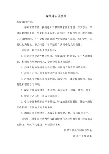 2014年4月10日,信息工程系分團委、學生會在三食堂正門外打出“以學為基,以學立行——優良學風,從我做起”的橫幅,并向全院同學發出學風建設倡議書。同學們都滿懷熱情的積極參與到活動中,并主動在橫幅上簽上自己的名字,紛紛表示,要從我做起,嚴格要求。