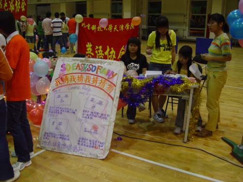 趣味游園活動形式多樣,不僅有個人游戲,還有團體小組游戲。其中,籃球協會的3對3趣味籃球比賽,是對抗性與趣味性的結合;科協的短信大賽,是熟練性與反應力的考驗;棋社的五子棋擂主爭霸賽,更是膽略與智慧的較量;還有乒乓球協會的乒乓球知識競賽、電影協會的魔術表演、書法協會的趣味尋寶等活動,都吸引了眾多同學積極參與。其間穿插的街舞、樂隊及健美操表演,更為輕松的氣氛添加了活力。