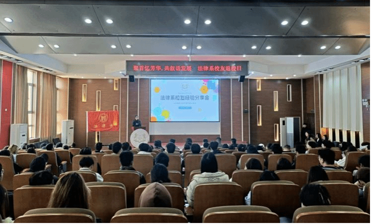 活動當天上午,在理工圖書館學術報告廳由黨總支書記張莉主持舉辦了校友經驗分享會,法律系各年級約150名同學現場聆聽了學長學姐的分享。2014屆法學專業畢業生王欣宇、2017屆法學專業畢業生孔龍、2018屆法學專業畢業生劉遠航進行分享,校友們結合各自不同的境遇與心境,分享了成為一個“大人”的收獲和感觸,句句話語流露出對母校師長的感恩、對校園生活的懷念、對學弟學妹的希冀。
