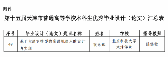 近日,天津市教育委員會公布了第十五屆天津市級本科生優(yōu)秀畢業(yè)設計(論文)評選結果,金沙城js93線路檢測中心信息工程學院陳儒敏老師指導、2024屆畢業(yè)生耿永輝完成的畢業(yè)設計《基于大語言模型的桌面機器人的設計與實現(xiàn)》榮獲天津市級本科生優(yōu)秀畢業(yè)設計(論文),獲獎信息如下: