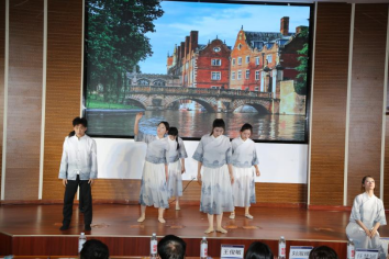 隨后,圖書館副館長(zhǎng)王瑞存與舞蹈系學(xué)子聯(lián)袂呈現(xiàn)的《再別康橋》將晚會(huì)推向高潮,飽含深情的朗誦如潺潺流水,與舞者輕盈柔美的身姿交相輝映,共同勾勒出詩人筆下那抹“揮一揮衣袖,不帶走一片云彩”的雋永意境。