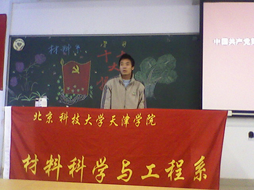 羅富臣老師在最后的總結中強調(diào),全系同學要把思想認識統(tǒng)一到十七大精神上來,材料系作為天津?qū)W院的新系,雖然人數(shù)不多,但我們要在十七大精神的指引下,在學院黨委的領導下,在全系同學的努力下,把材料系建設成為全院師生滿意的系,要為材料系的明天而努力奮斗。