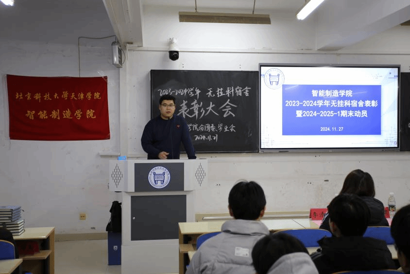 為表彰先進典型、樹立學習標桿,激發廣大學生的學習熱情,智能制造學院分團委、學生會于11月27日下午在9教104舉辦2023-2024學年無掛科宿舍表彰大會暨2024-2025-1期末動員,智能制造學院院長朱超甫、黨總支書記陳月、副院長班嵐、2023-2024級輔導員出席,200余名學生干部參加,活動由分團委書記李雲嘯主持。