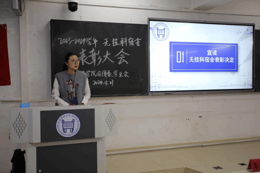 朱超甫院長與陳月書記共同為2023-2024學年無掛科宿舍頒發榮譽證書及紀念品。
