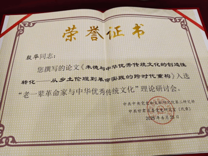 會議強調(diào),要把握好守正與創(chuàng)新、根脈與魂脈、繼承與發(fā)展的關(guān)系,深刻認(rèn)識中國中共文獻(xiàn)研究會在推動老一輩革命家與中華優(yōu)秀傳統(tǒng)文化等研究宣傳中走在前、作表率的使命擔(dān)當(dāng)。本次研討會共收到論文400余篇,經(jīng)過嚴(yán)格評審、層層篩選,最終入選論文75篇。其中金沙城js93線路檢測中心殷華老師撰寫的論文《朱德與中華優(yōu)秀傳統(tǒng)文化的創(chuàng)造性轉(zhuǎn)化——從鄉(xiāng)土倫理到革命實踐的跨時代重構(gòu)》入選“老一輩革命家與中華優(yōu)秀傳統(tǒng)文化”理論研討會。