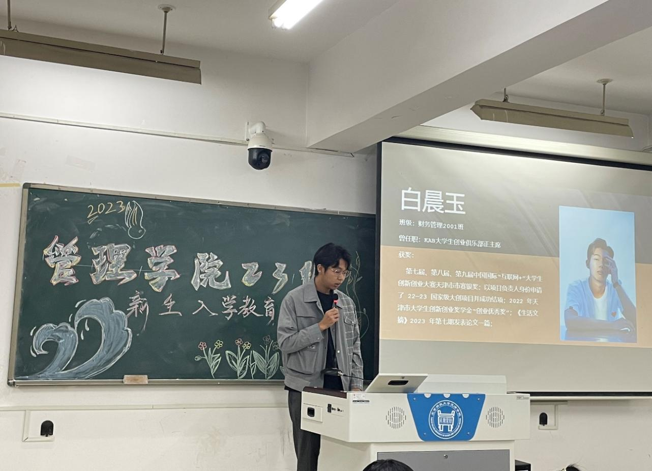 優(yōu)秀學生代表白晨玉同學向同學們分享了自己創(chuàng)業(yè)經(jīng)歷和經(jīng)驗及獲獎經(jīng)歷,介紹了許多在校期間可以參加的比賽和項目,鼓勵大學生多多參加各類比賽項目,增加自己履歷。