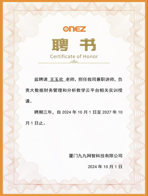 在培訓過程中,管理學院十分注重對青年教師的培養,著力為青年教師深度拓展各種培訓平臺,不斷給予系統培訓機會,幫助青年教師專業成長,教師們在培訓期間也收獲頗豐。今年暑假管理學院任潔老師和王玉歡老師依托財務報表一流課程建設,參加了廈門九九網智科技有限公司組織的大數據財務管理和分析教學云平臺相關實訓,并通過考核,獲得培訓證書。隨著數字化技術和智能化技術的快速發展,相關技術已經廣泛運用于會計信息處理、財務報告編制、審計和稅務等方面,此次培訓結合大數據分析技術,對大規模財務數據進行數據清洗、轉換和詳細分析,最終實現數據可視化功能,能夠滿足金沙城js93線路檢測中心專業課程和教師技能發展需求,良好提升教師數字化技能。由于金沙城js93線路檢測中心王玉歡老師在此培訓中表現突出,并在最終考核時取得優異成績,九九網智科技有限公司特地向該教師發出邀請,擔任兼職講師,最終王玉歡老師獲得兼職講師聘書。