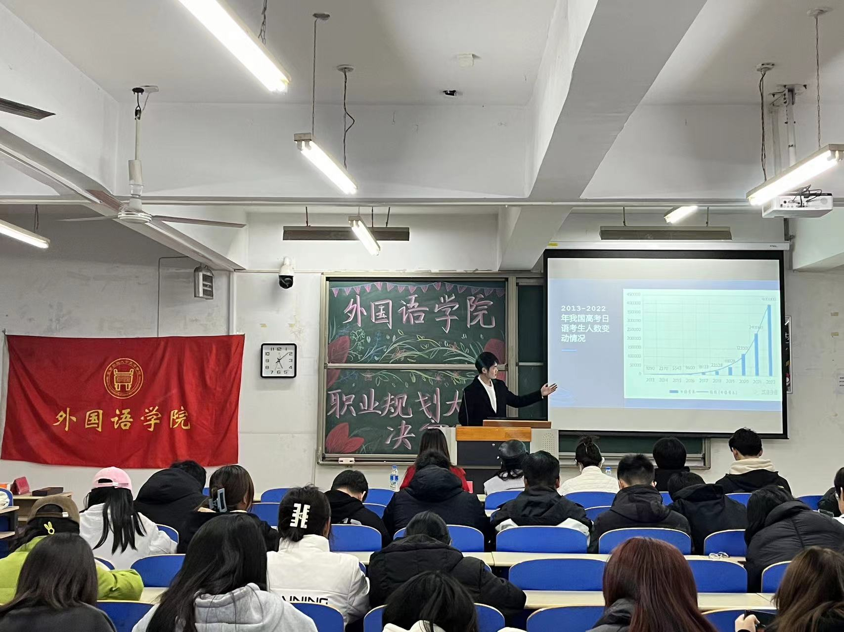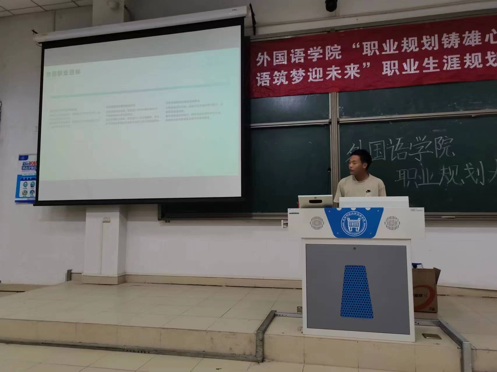 本次大賽分為班級賽和院賽復審、決賽三個階段。選手們通過提交職業生涯發展報告、個人陳述視頻、生涯展示PPT,結合職業目標、行動成果、目標契合度等方面對生涯報告進行陳述和展示,通過分析市場需求和個人發展前景,制定了切實可行的職業規劃。最終,2023年11月8日在9教104舉辦本次大賽院賽決賽,外國語學院黨總支書記吳思、日語教研室主任孔令蕾老師以及各年級輔導員出席并擔任評委。