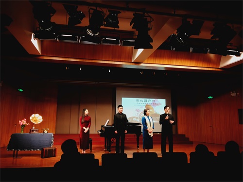 本場音樂會以留聲機為時代線索,不僅演唱了從清末民初到中華人民共和國成立前多位優(yōu)秀作曲家的藝術(shù)歌曲,還站在歷史的角度為觀眾講述了整個時代作品的創(chuàng)作背景及風(fēng)格,讓觀眾欣賞作品的同時,更加了解每一首作品及作曲家和時代背景。本場音樂會從舞臺道具、演員服裝選擇、燈光效果及節(jié)目單海報制作都僅僅圍繞時代特色,表演者演唱了蕭友梅、趙元任、黃自、賀綠汀等作曲家的代表性作品,其深情的歌聲將現(xiàn)場觀眾帶入到了不同時期的意境當(dāng)中,引起強烈共鳴。