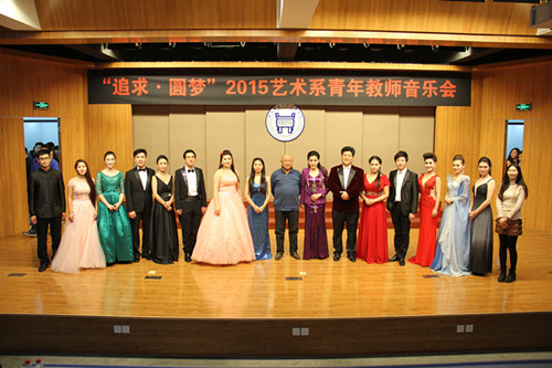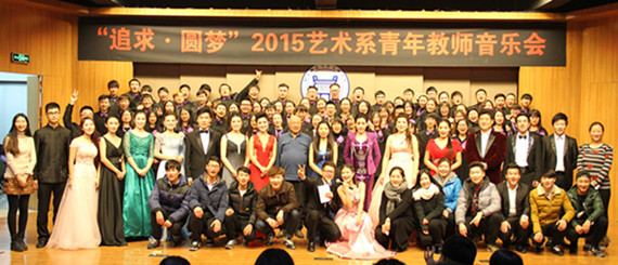 音樂會以“追求·圓夢”為主題,展示了藝術系青年教師積極向上、拼搏進取的精神風貌。音樂會以由青年教師陳倩擔任指揮,院學生藝術團民樂團演奏的民族管弦樂合奏《賽馬》開場,共有11個節目,涵蓋民族管弦樂合奏、合唱、美聲獨唱、民族聲樂獨唱、鋼琴獨奏、鋼琴四手聯彈、手風琴獨奏、古箏獨奏等多個類型,展示出了藝術系教師精湛的專業水平和綜合全面的個人能力。演出在由青年教師范璟玉擔任指揮,院學生藝術團合唱團演唱的大合唱《Hallelujah》中結束。音樂會獲得了全院師生的廣泛好評。系主任胡建華教授、藝術教育中心主任林碧蕓與各演職人員合影留念,并鼓勵教師繼續努力提高專業水平和加強個人修養,爭取再創佳績,為藝術系贏得更多的榮譽,為學生樹立良好的榜樣。
