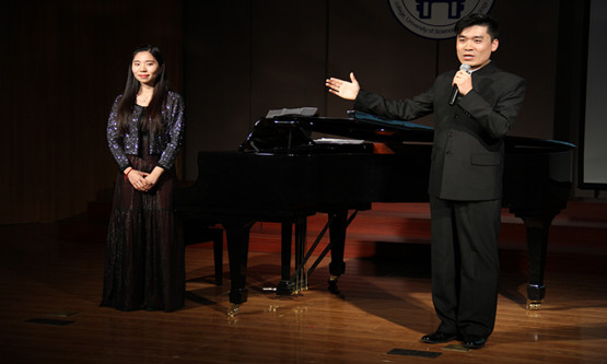 在演出結束后,藝術系主任胡建華教授對本音樂會進行了專業性點評,對聲樂教師劉義寶這場別出心裁的音樂會給予了很高的評價,并鼓勵系內青年教師多多開展形式新穎的音樂會;向藝術系學生傳達這次音樂會不只是要向大家介紹音樂家及作品,更是希望藝術系聲樂演唱專業方向的學生能在演唱藝術歌曲的同時,對時代背景及作品進行思考。