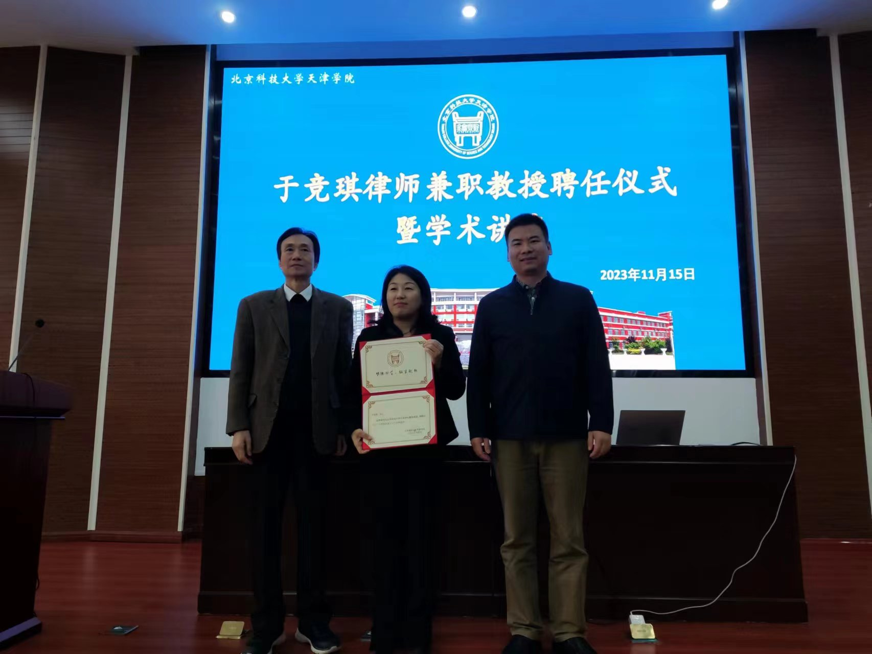 11月15下午3時,北京科技大學天津學院于競琪律師兼職教授聘任儀式暨法學論壇系列講座第四期活動在理工館報告廳如期舉行。
