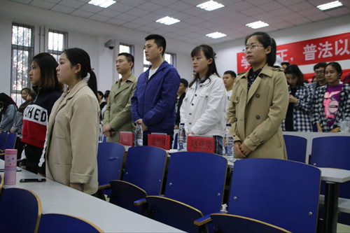 為深入學習研究宣傳貫徹十九大精神,推動法律系師生更加自覺地以新思想引領新實踐,為堅持全面依法治國基本方略、深化依法治國實踐作出應有貢獻。2018年 4月 25日由法律系分團委主辦的“法律系第十三屆模擬法庭”在第8教學樓生動上演,由學生們擔任審判長、審判員、公訴人、辯護人、被告、人證和法警等角色,通過視頻了解本次案例,模擬審判了一起大學欺凌致人死亡案件。
