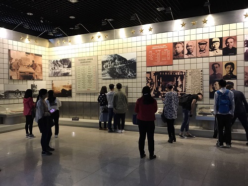 平津戰(zhàn)役的勝利,推動(dòng)了中國革命的歷史進(jìn)程,為中華人民共和國的誕生奏出了一部氣勢(shì)恢宏的交響曲。在了解了紀(jì)念館的總體情況后,大家開始了此次參觀學(xué)習(xí)之旅。走進(jìn)館內(nèi),首先看到的是毛澤東、劉少奇、朱德、周恩來和任弼時(shí)五位偉大革命領(lǐng)袖們高大的銅像。學(xué)生黨員們瞻仰了五位偉人的雕塑,并在鮮紅的黨旗前重溫入黨誓詞,牢記黨的宗旨。隨后,同學(xué)們逐漸參觀了戰(zhàn)役決策廳、戰(zhàn)役實(shí)施廳、人民支前廳等展廳。一幅幅生動(dòng)的照片、一件件珍貴的文物,無不彰顯著共產(chǎn)黨人對(duì)理想的不懈追求。通過大量照片、文獻(xiàn)、實(shí)物等展品,大家全面了解了平津戰(zhàn)役從發(fā)起到勝利結(jié)束的光輝歷程。
