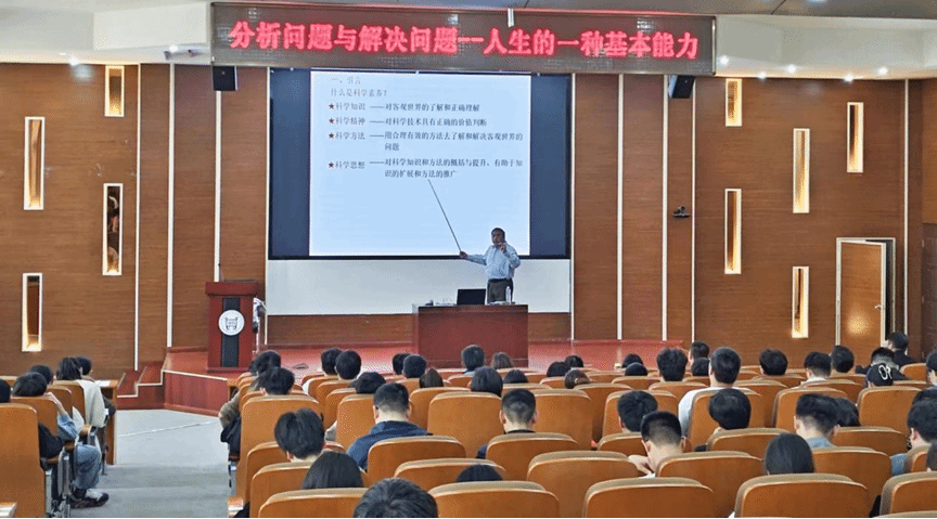 朱超甫教授先由“什么是科學素養”導入話題,指出無論是工作還是生活,都是一個不斷面對問題、解決問題的過程。成功解決問題并非易事,它需要我們深入剖析問題的根源或真實狀態,而這正是通過科學分析問題來實現的。因此,對于每個人來說,分析問題與解決問題不僅是一種技能,更是一種生活智慧。從而提出要培養學生分析問題與解決問題的能力,要能學以致用把學科知識運用到工作和生活中去。朱教授結合在工程實踐中的多個成功案例,深入淺出地講解如何運用“分析問題與解決問題”的思路與方法。他分享了如何準確識別問題、如何系統分析問題,以及如何高效解決問題的方法和技巧。這些方法和技巧不僅適用于工程領域,更可以廣泛應用于我們日常生活的各個方面。
