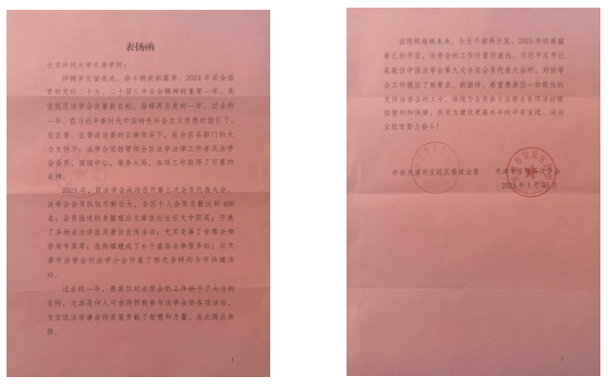 近日,金沙城js93線路檢測中心收到了來自中共天津市寶坻區委政法委、天津市寶坻區法學會的表揚函,對金沙城js93線路檢測中心在法學研究、法治人才培養以及法律系教師積極參與區委政法委、區法學會各項工作所做出的突出貢獻給予高度贊揚。 2024年,金沙城js93線路檢測中心教...