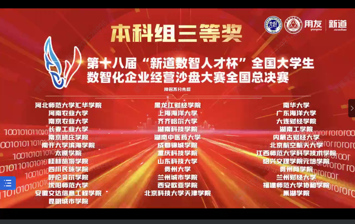 由中國商業聯合會主辦的第十八屆“新道數智人才杯”全國大學生數智化企業經營沙盤大賽全國總決賽于11月5日落下帷幕。管理學院會計學專業蔣婷、古宏濤、王鑫宇和李青潤四名同學參加了此次比賽。 經過激烈的角逐,四位...
